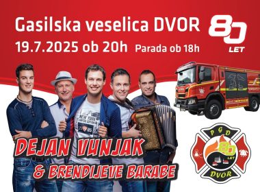 PGD Dvor letos praznuje 80 let delovanja, zato bo sobota, 19. julija 2025, še posebej slavnostna. Ob 18. uri bo pred gasilskim domom potekala velika parada, ob 20. uri pa sledi veselica pod šotorom v Dolenji vasi z Dejanom Vunjakom & Brendijevimi barabami. Za pravo vzdušje bodo poskrbele tudi pizza iz krušne peči, palačinke in bar na vodi – cvetličarna.