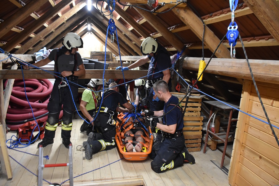 V prvem delu smo ponovili postopke nudenja prve pomoči, stabilizacijo poškodovanca ter uporabo zajemalnih in koritastih nosil. Sledila je zahtevna naloga prenosa poškodovanca iz višine. Druga ekipa je medtem namreč pripravila sidrišča in vrvno tehniko, s pomočjo katere smo ga varno in kontrolirano spustili na tla skozi odprtino v stropu.
